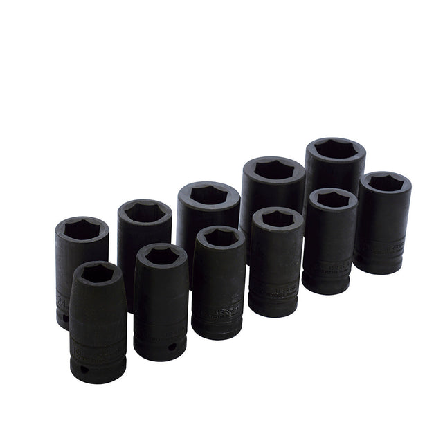 -Juego de 11 dados de impacto largos metricos 3/4" -Juego dados impacto cuadro 3/4" largo 11 pz metrico 6 puntas geometria lobular super-drive, acabado fosfatado, medidas de 19mm a 32mm