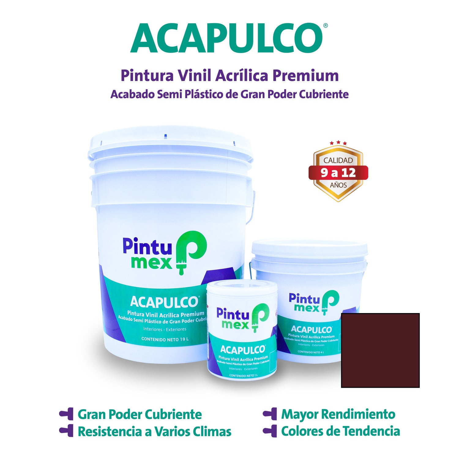 ACAPULCO es una pintura base agua con ACABADO MATE PLASTIFICADO DE LUJO, 100% LAVABLE con un GRAN PODER CUBRIENTE, RENDIMIENTO y RESISTENCIA IDEAL PARA CUALQUIER TIPO DE CLIMA. Recomendado para INTERIORES Y EXTERIORES. Rendimiento de 9 a 10 m² por litro