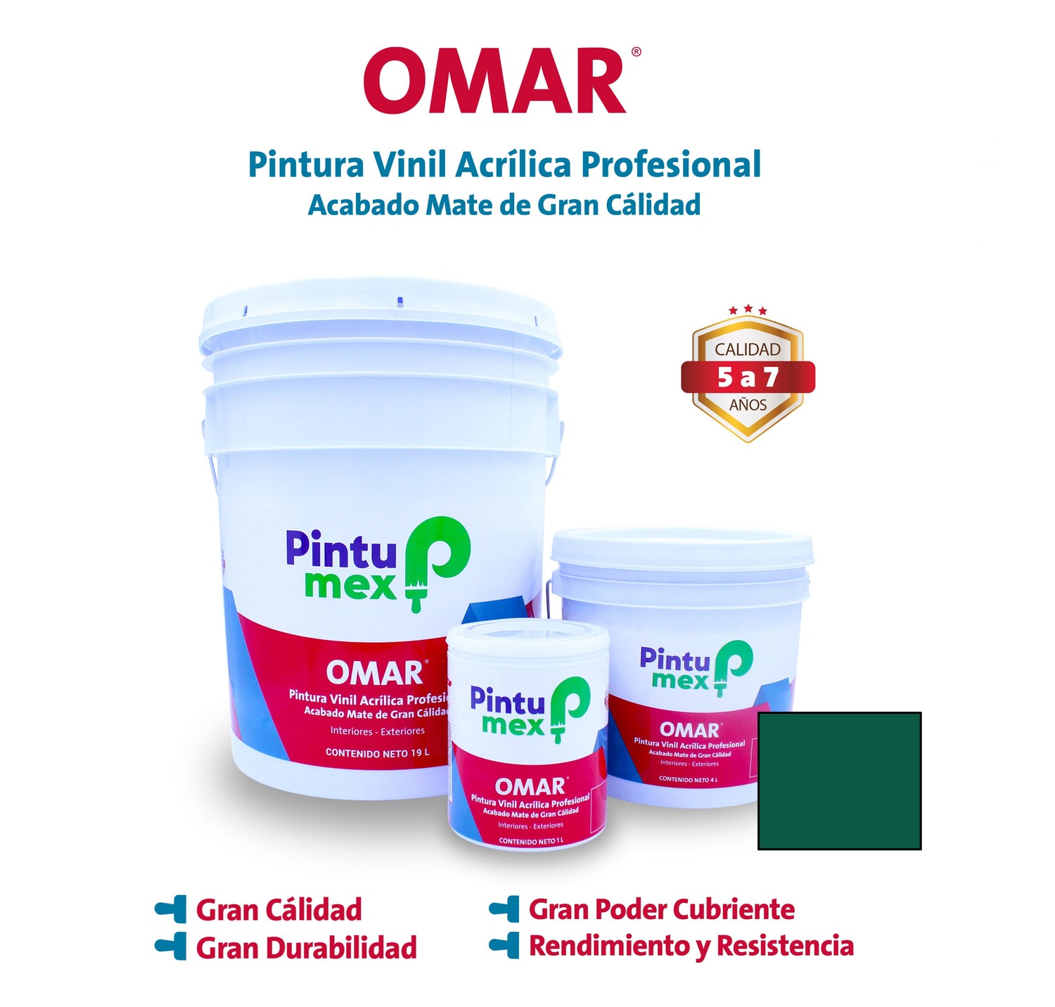 OMAR es una pintura base agua con ACABADO MATE. De gran poder CUBRIENTE, RENDIMIENTO y RESISTENCIA. Para USO PROFESIONAL, COMERCIAL Y DOMÉSTICO. Rendimiento de 6 a 7 m² por litro. Garantía de calidad de 5 a 7 años.