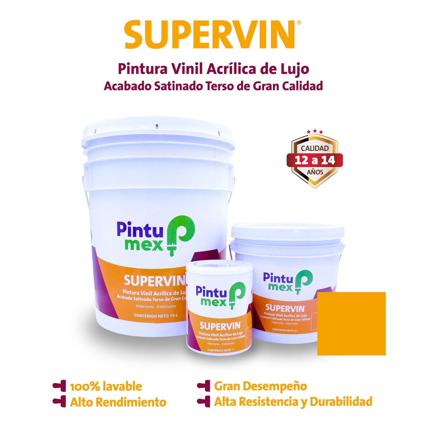 SUPERVIN es una pintura base agua con ACABADO SATINADO DE LUJO, 100% LAVABLE, de ALTO DESEMPEÑO, GRAN PODER CUBRIENTE, RENDIMIENTO, RESISTENCIA y DURABILIDAD.